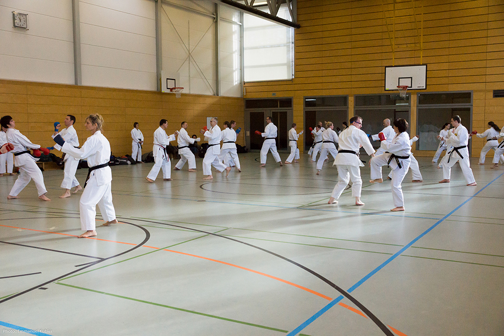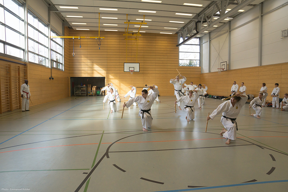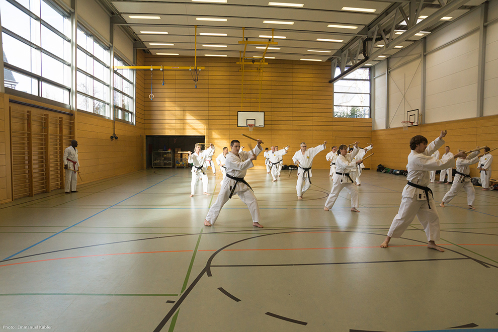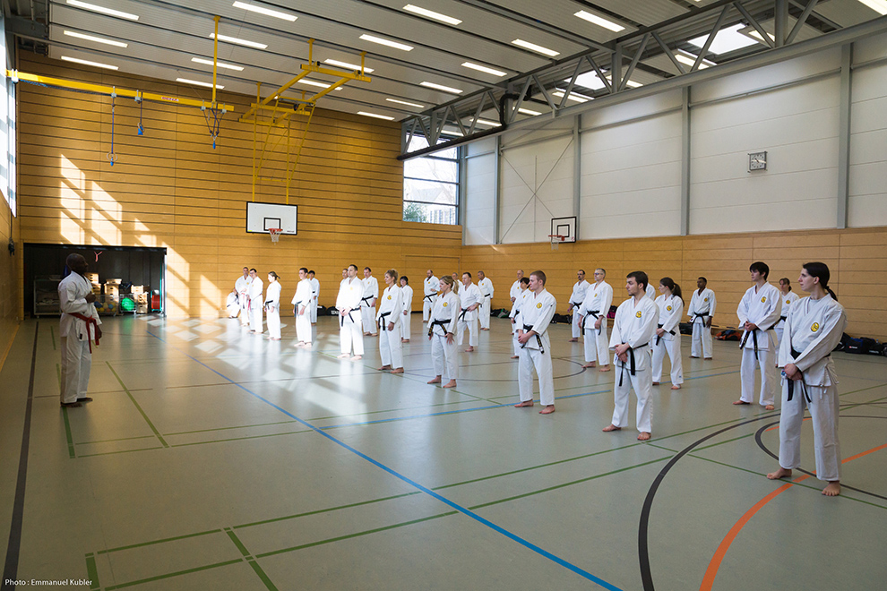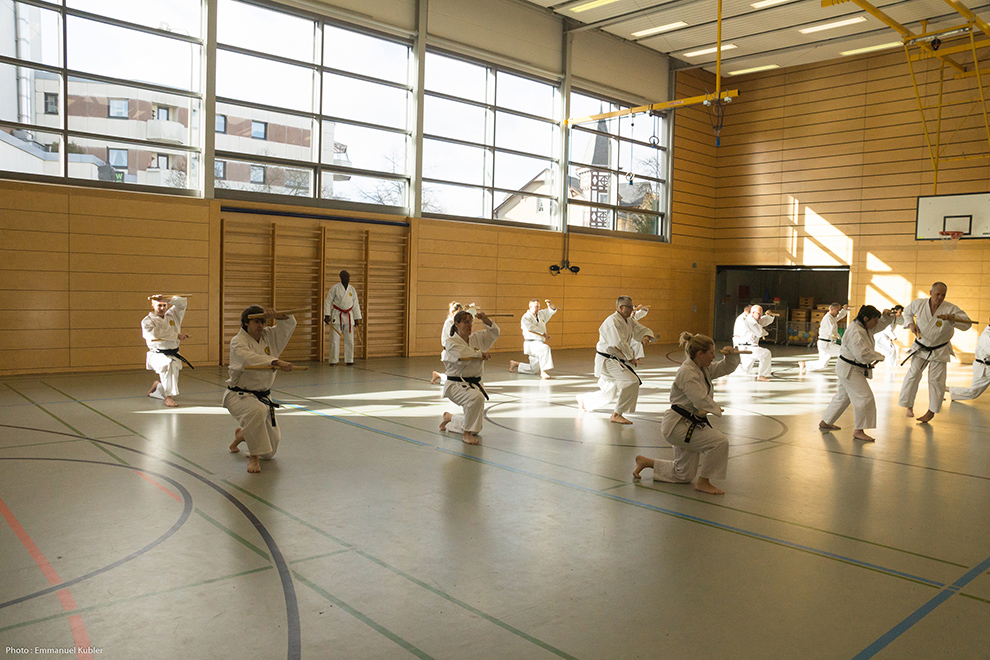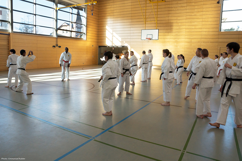 Après un court briefing dispensé par Sensei Axel Roth, nous nous sommes rendus dans la salle de sport d’un collège proche.